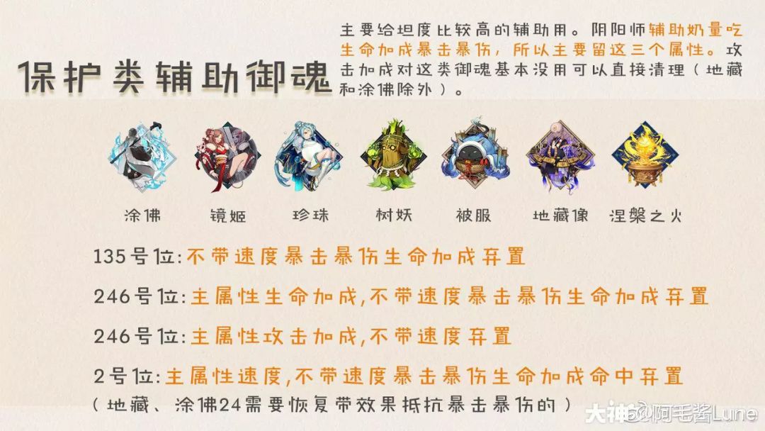 辅助类御魂主要看功效而不是御魂自身的加成!所以要按照功效分类别来整理哦。这类御魂主要给坦度比较高的辅助用。阴阳师辅助奶量吃生命加成暴击暴伤,所以主要留这三个属性。攻击加成对这类御魂基本没用可以直接清理(地藏和涂佛除外,需要在整理完后另外恢复。)