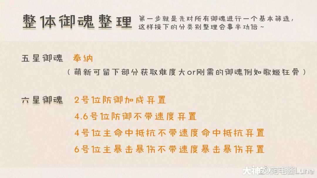 整理思路是从整体到局部,so第一步就是先对所有御魂进行一个基本筛选,这样接下的分类别整理会事半功倍~防御加成如果不能加速度收益不大,命中抵抗暴击暴伤等对附属性要求很高的御魂也可以先整理