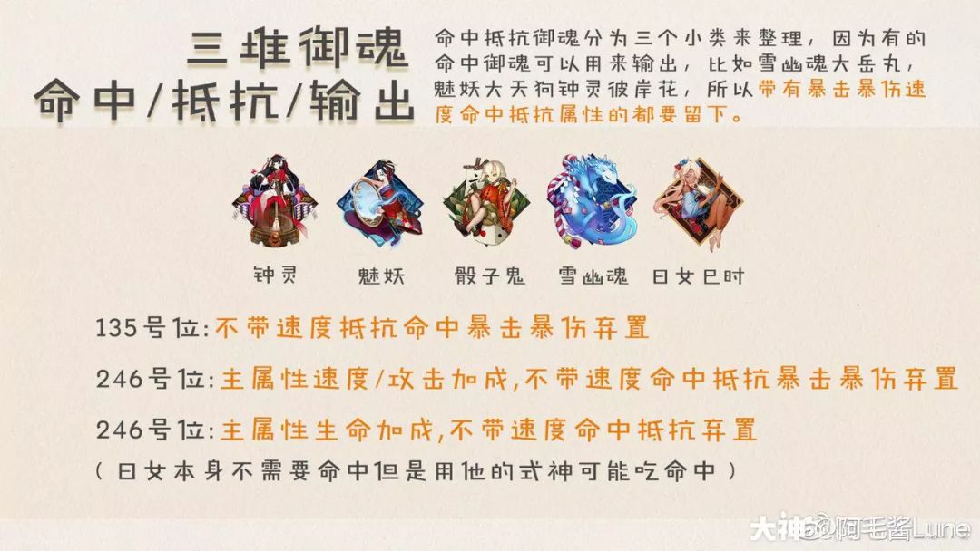 命中抵抗御魂分为三个小类来整理,因为有的命中御魂可以用来输出,比如雪幽魂大岳丸,魅妖大天狗钟灵彼岸花,所以带有暴击暴伤速度命中抵抗属性的都要留下。日女需要注意一下,他本身是不吃命中的,但是使用他的式神可能技能本身需要命中,所以也尽可能留一下。