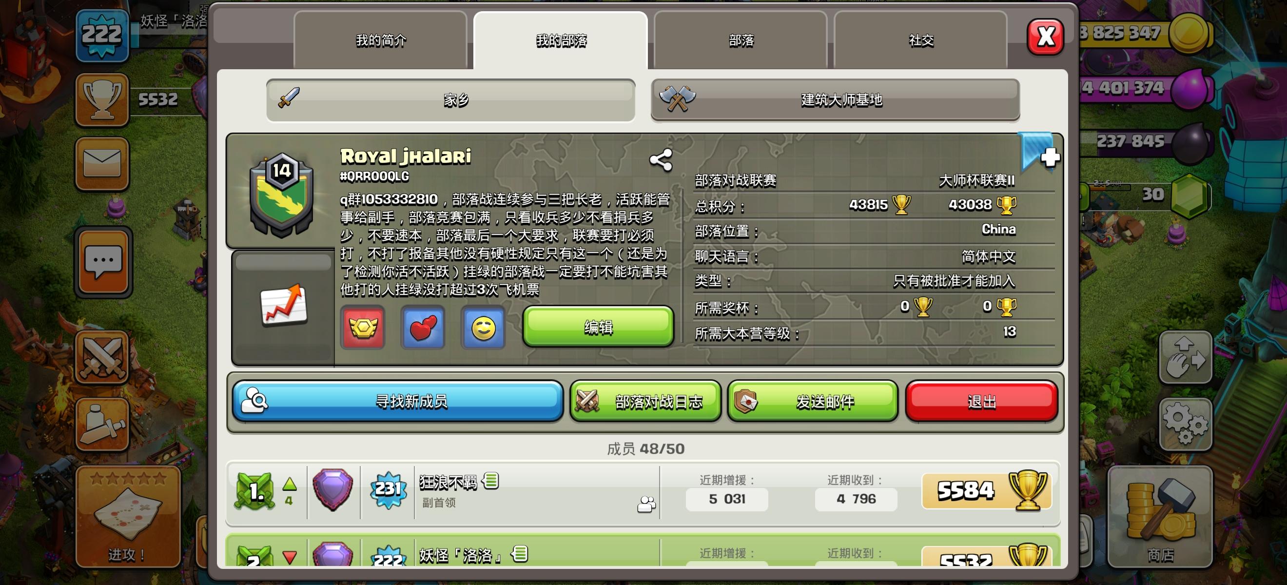 主部:双奶部落招人,14本不速的,活跃的玩家。联赛级别大师2,部落标签#QRR00QLG