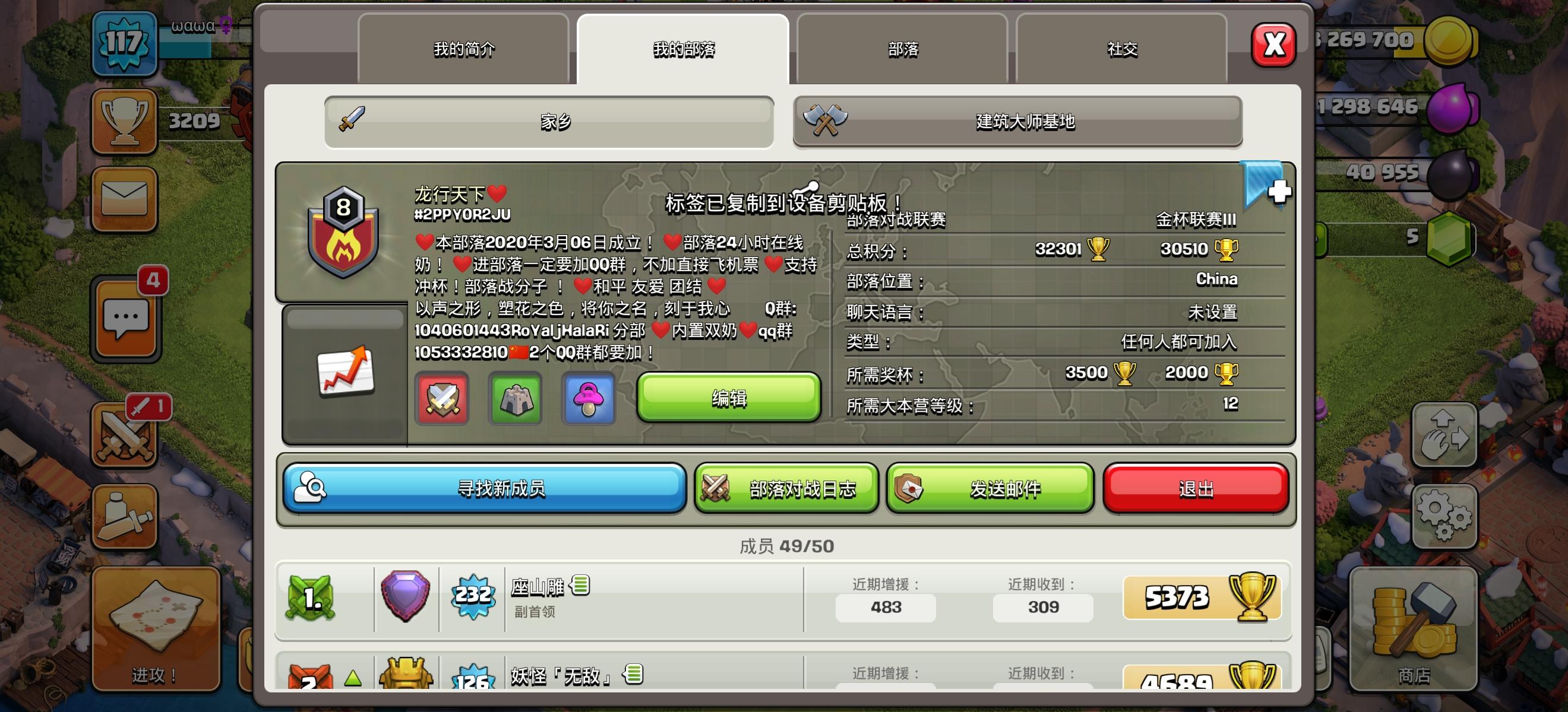 分部:双奶部落 龙行天下 招人,11本以上不速的,活跃的玩家,联赛级别金杯3,部落标签#2PPY0R2JU