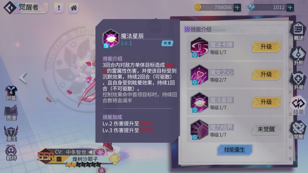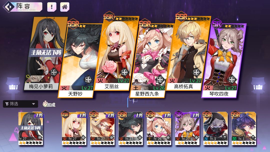 2.其他就是一些功能性角色的培养。奶,盾,控制,考虑到火不够用的问题,尽量选择一些技能点消耗低的角色。或者一些工具人。推荐天野妙+九条+沙耶子。