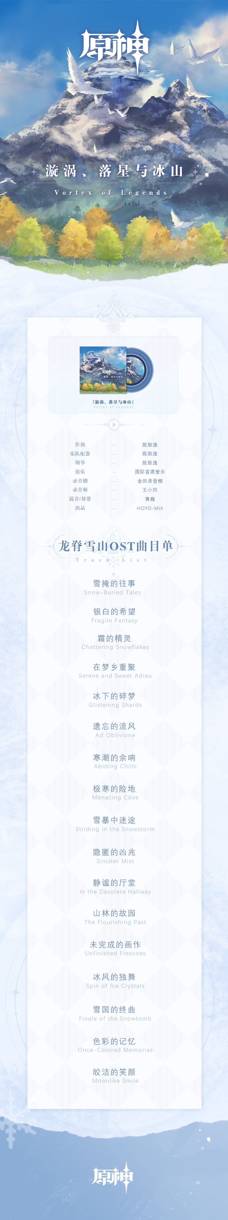 《原神》龙脊雪山主题OST《漩涡、落星与冰山 Vortex of Legends》正式上线,共收录17首由陈致逸@ HOYO-MiX为《原神》龙脊雪山地区创作的原声音乐。