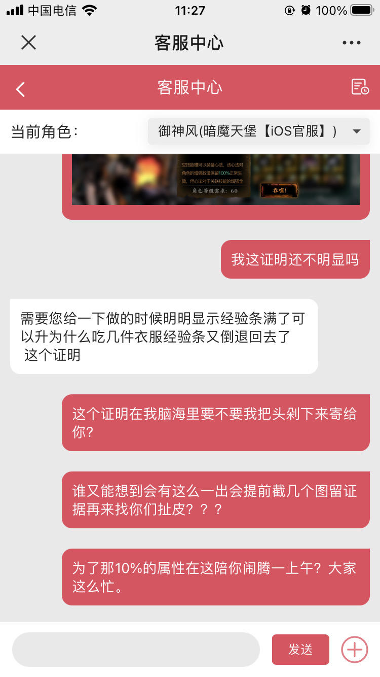 昨晚在贴吧看到有人问60宗师衣服属性我见没人解答于是乎想着晚上自己做一件看看自己也可以留着用。之前刷图爆了两件加上合的一件一共有3件。用300橙晶石加机械全部升到60。其中有一件属性几乎全满(升之前没有改造)升好后改造最后只剩生命没满!当时生命是621。离满生命659差不了多少。当时砸锅卖铁把所有材料兑换用光了把两件60的放吞噬里面清清楚楚的看到是满经验的。可是一吃完就卡顿一下然后衣服不但没宗师经验会回退了。今天找客服反馈客服那边技术人员找不到原因就开始推脱也不给予补偿。大致的内容就是一个劲的要我提供没吞噬之前的截图和吞噬期间的截图和之后的截图。我想请问谁会玩个游戏一直不停去截图?再说我也没有未卜先知的能力。我若知道它会倒退经验我肯定在吞噬的时候录屏了!你们不能店大欺客这样打发人吧?每个玩家都不容易!材料说难搞也不难搞!说不难搞也是要花心思和时间去搞的有的甚至还要花钱搞。问题查不出来也不补偿难道我这材料就白白丢了吗?今天在贴吧问没想到不止我一个人碰到这种问题其它人也有遇到的。我不知道别人的是怎么处理的但请把我这个处理一下吧!