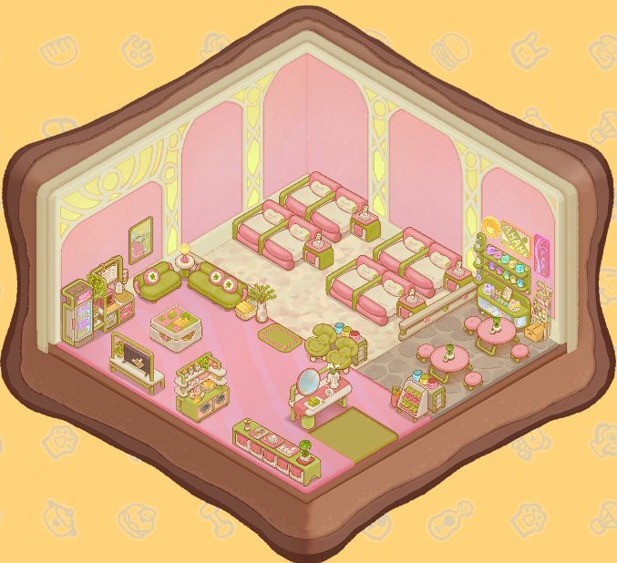 •休息室(翠花旅店皮肤同款风格,绿油油沙发加上粉红甜蜜大通铺,亮黄点缀的墙纸增添无限活力,用色大胆实属惊艳)