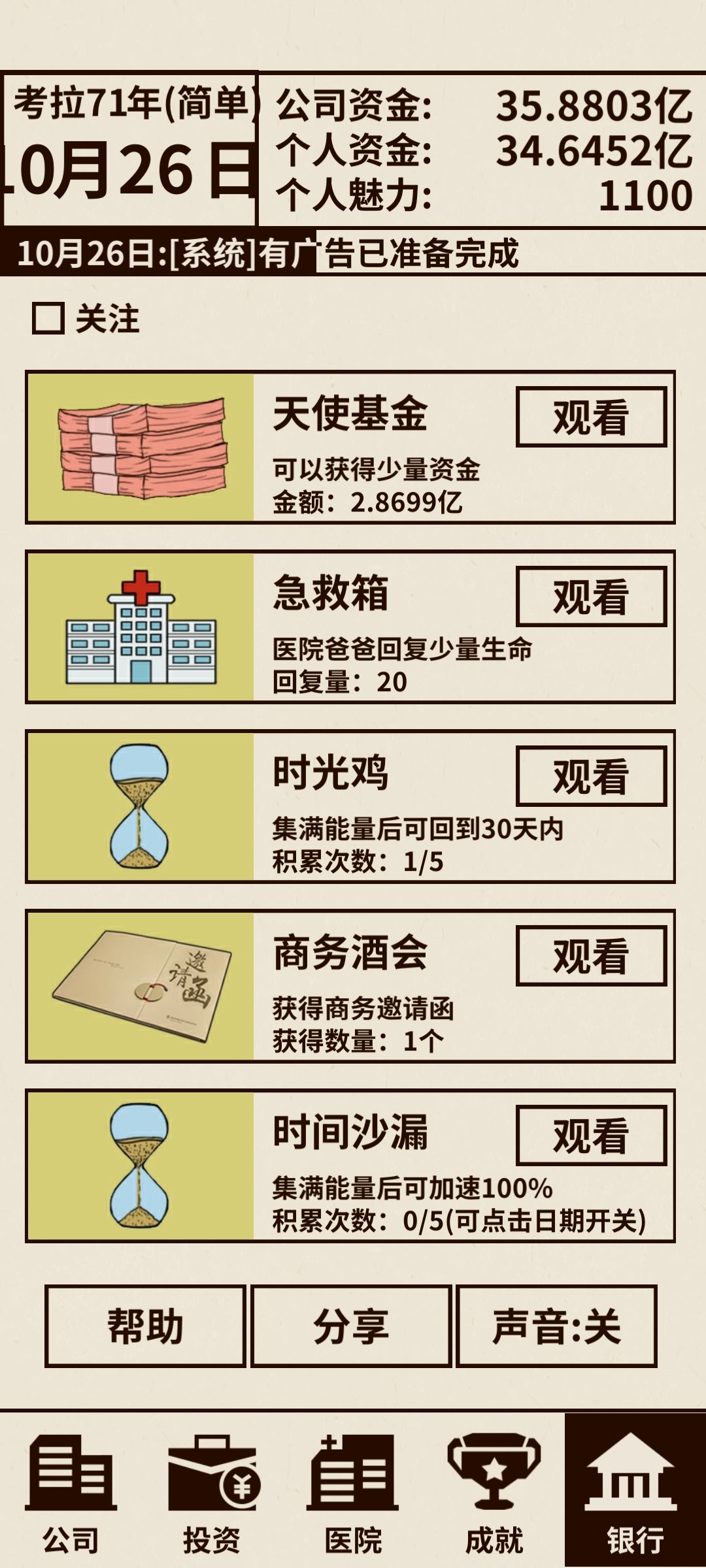 医疗类:努力升级 最好不要让病情恶化 病情恶化需要药物来稳定 药物研发不够就不能阻止恶化而药物的研发和魅力值挂钩,所以一般确保自己的魅力值可以继续研发药物,但后期反而手术不用花很多钱 一般光看广告生命值就是1000满的,前提就是一定要把等级提升差不多就治疗
