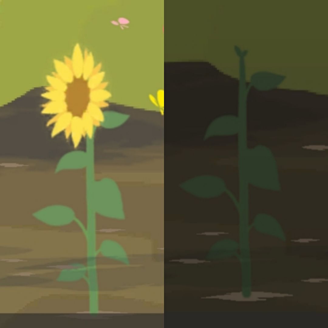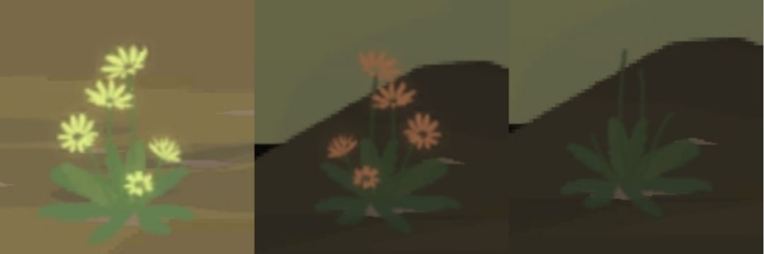 2.每日种出的太阳花颜色、形态都随机,仅在白天开花,吸引蝴蝶,晚上秃头。