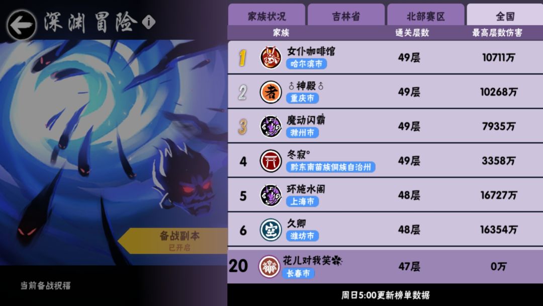 冲刺层47+ ,这时候就在比剩余的卡牌能打出多少输出了。此时深渊也快结束了,次数也剩的三三两两,组织好人员和队伍,满员冲进去,放大招,丢蛮力符,掉次数了就出来接着来,抢时间抢伤害,一般家族都会8.58左右最后一次进了boss,打完出来9.00正好次数用光时间用光,有时候层数打的高次数用不完剩1-2次都是比较正常的。