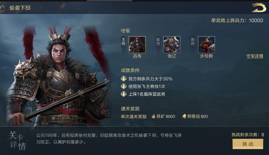 2、敌方阵容:主将 吕布(骑兵4000兵力),张辽(骑兵4000兵力),步校尉(步兵4000兵力)