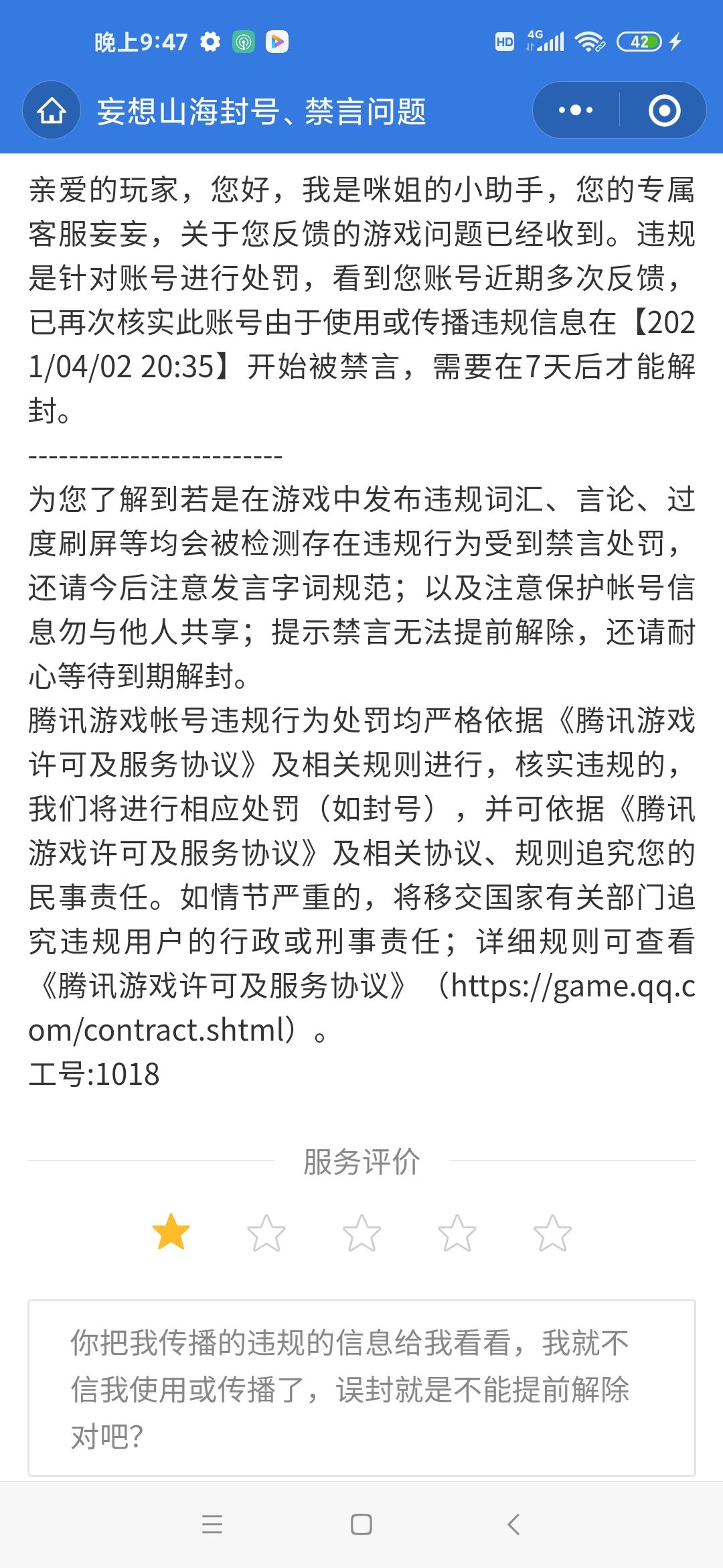 联系客服就是让你填个申诉表,然后3天后回信息告诉你是因为游戏违规被处罚的,至于哪里违规了,他们不会查,或者说懒得查,当然也没办法告诉你。
