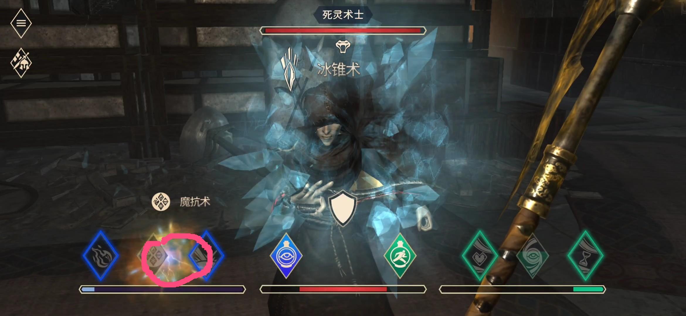 魔抗术是有施法时间的,释放时上图圈的地方会有个小动画,一定要等动画放完才算施法完毕,期间不可做任何动作,否则施法会被打断,比如刚点完魔抗术的图标立刻平砍,是不会有效果的,就像魔兽里法师读条施法时你左右移动会打断施法一样。