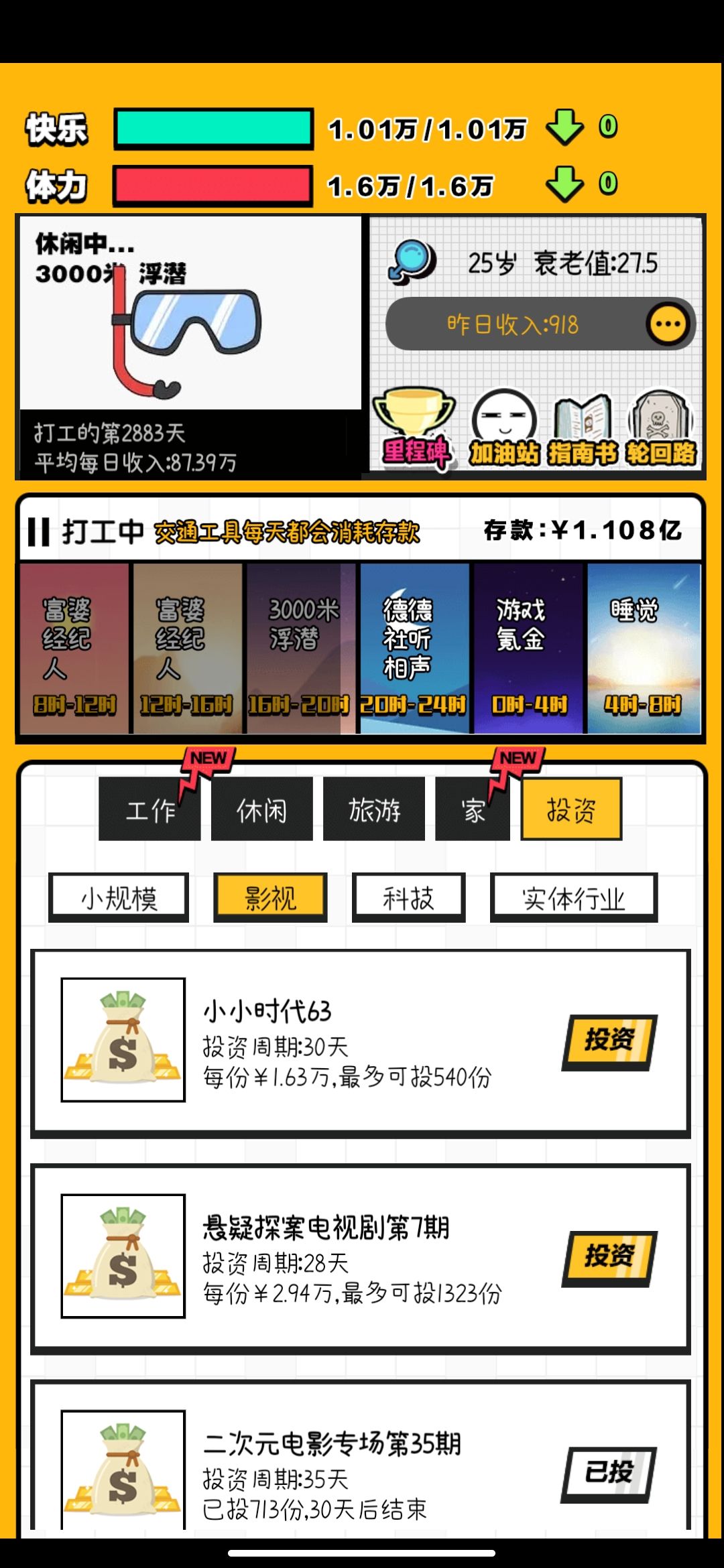 后期略无聊,代练先攒点积蓄,然后咬死小小时代投资,慢慢雪球就滚大了,然后可以投资二次元电影和古装情景剧(这两个会有起伏,但是总的趋势是赚钱的)。雪球越滚越大。就靠这三个投资,攒到1000万就可以投资科技和实体。目前观察是科技比实体的赚钱率高,不容易赔。