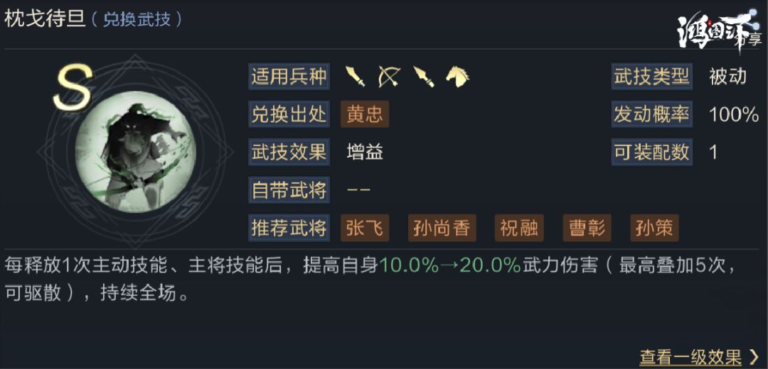 说明文字1号武技推荐枕戈待旦,该技能可让张飞每次释放技能后都获得20%的武力伤害加成,满层后100%的伤害提升配合暴击,能让辕门打出“追梦一击”。当前版本很少遇到带驱散或张燕的队伍,该技能的效果足够稳定。