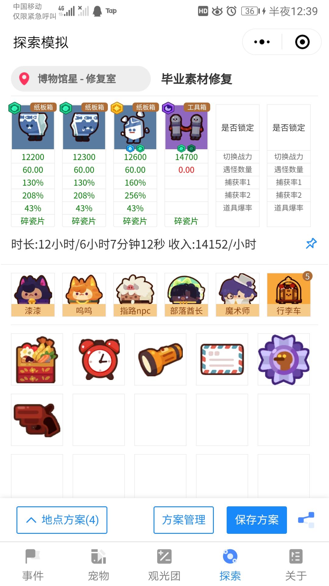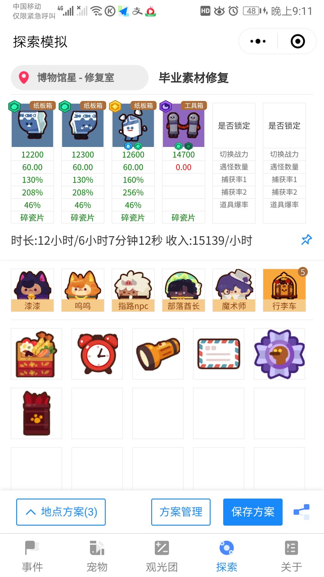 这里放5小时食物的原因解释下,因为多余的可以塞瓶子或者纸板箱,顺便可以把这个图的蓝色宠物抓到5级,我的血迹就是这样从1级到5级的。同时手机也刚好出9个指纹,以下的图食物给的不准确,大家可以根据宠物的产出调整下探索时间。