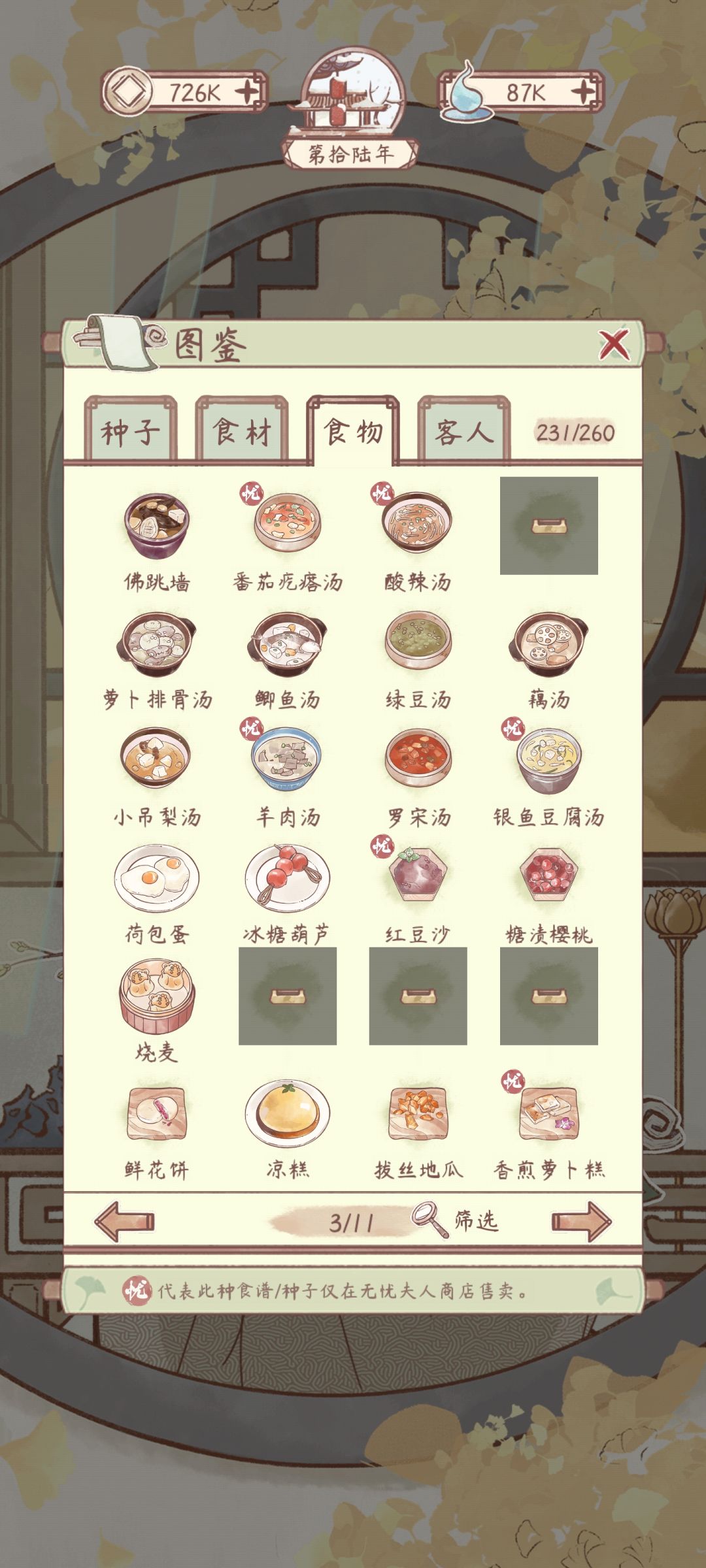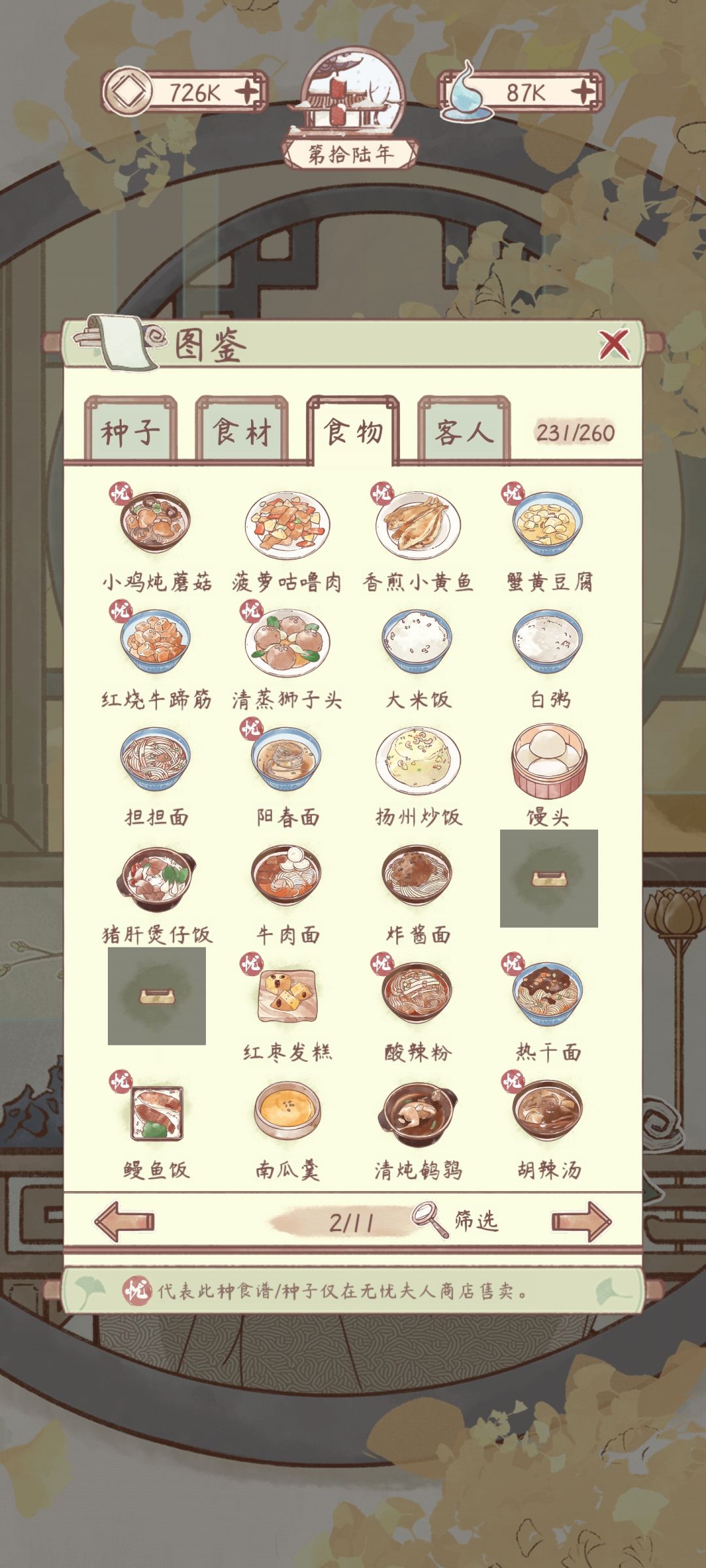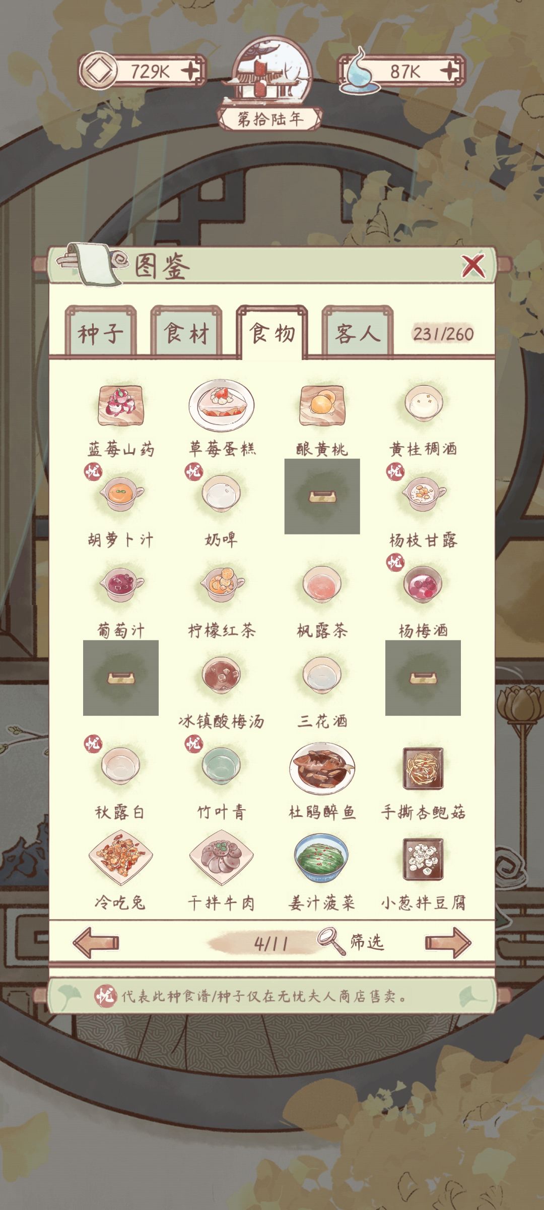 花***粥有菜谱,材料不够还没有做。其他空缺的是成就菜谱