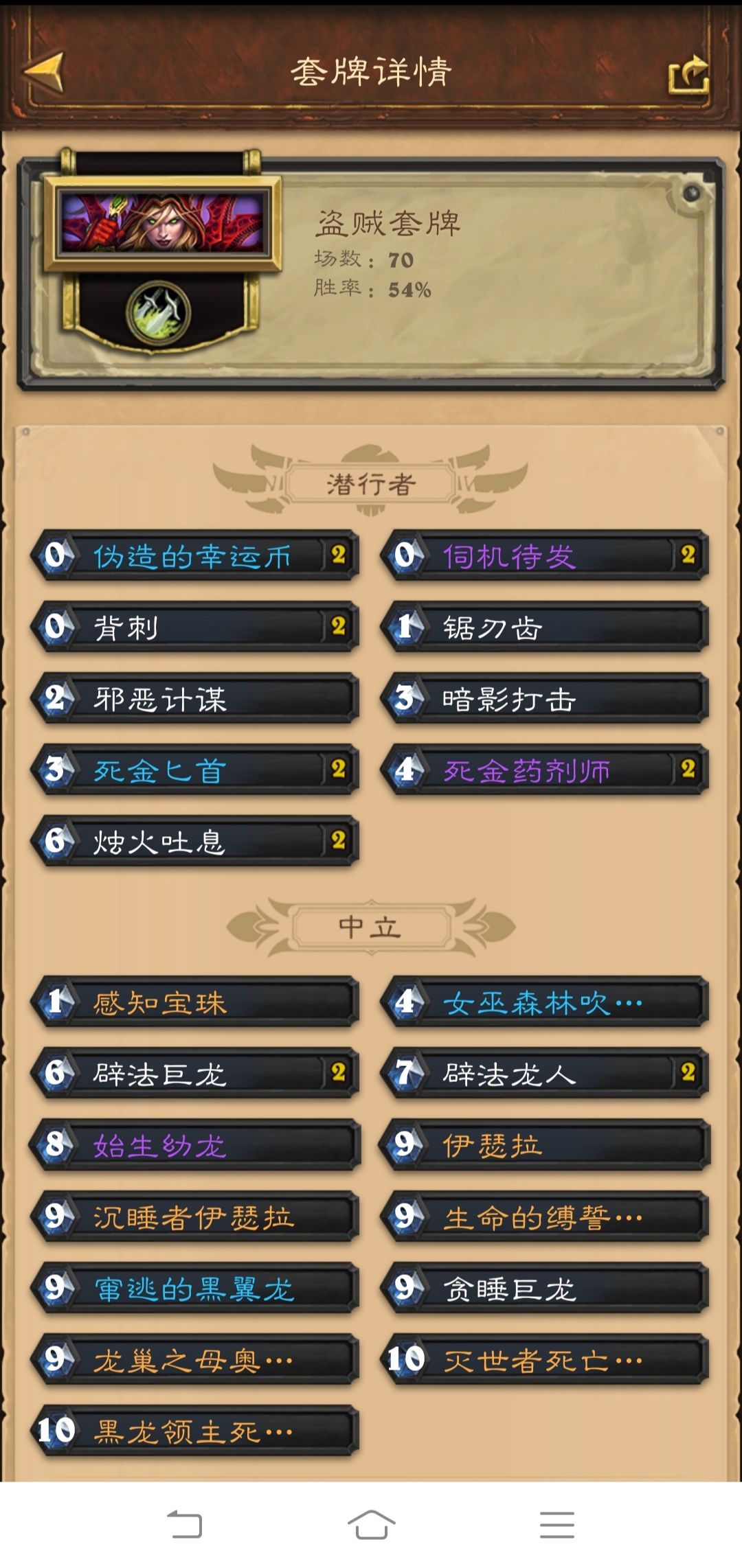 几个赛季前的老卡组了,但随着上个版本感知宝珠和这个版本新的五色巨龙的加入后,强度有了明显的提升。同时死金药剂师的回调,让这个卡组在狂野不在是单纯的娱乐卡组了,不能说是稳定上分,但强度和快乐是有的。打了70把,遇到牧师和战士是大劣势,遇到圣骑士、猎人、萨满、德鲁伊和恶魔猎手是优势。法师、贼和术士五五开。