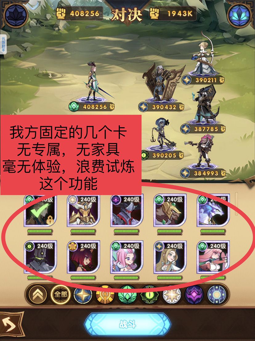 【 解决办法:🌟🌟🌟 所有英雄人物,试炼里面己方的英雄改成 “ 全英雄图鉴,309的强度 ”。去掉系统固定的就那几个,设置新英雄必须上阵,玩家在下面的全图鉴卡池里自行研究和组合,不管是旧的英雄,还是你们新出的新卡,玩家第一时间就能在试炼里面自己研究和组合,匹配,玩家能开发出更多的组合和运用技术方法。
