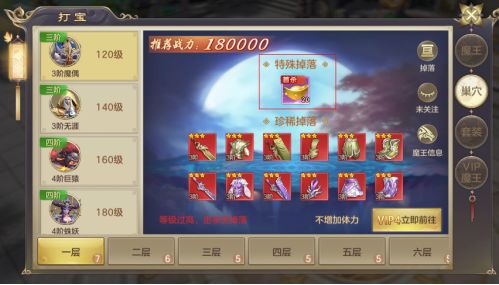 3.从打宝图标可以进入巢穴,每一层的BOSS首次击杀后就可以获得首杀的元宝奖励。 巢穴地图一共7层,合计可以拿到1100元宝的首杀奖励。