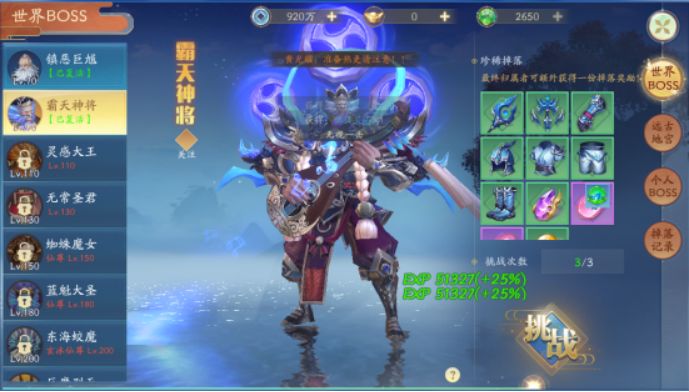 世界boss,50级开启 世界boss每天有5次挑战上限次数,当次数不足5次时,每2小时恢复一次,每天最多恢复2次,击败boss扣除一次挑战次数。世界boss可以组队,对世界boss造成伤害排名第一的玩家或队伍,额外获得一份掉落奖励,如果是队伍伤害第一的话,则队伍的所有成员都会获得额外奖励;伤害第一的玩家除了获得归属奖励之外,更有一份额外掉落奖励,boss被抢不要怕,一键协助来帮忙,伤害排名第一的组队玩家可同时获得掉落奖励和额外奖励哦;世界boss主要产出装备,经验丹,元宝,也有几率掉落羽毛,守护之魂等大量珍稀道具。