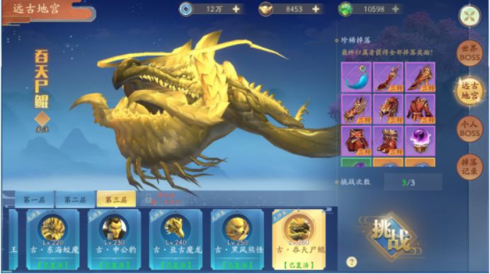 远古地宫中存在boss和精英两种怪物,地宫boss每天有3次挑战次数,地宫精英每天有8次挑战次数;地宫精英:出没在地宫的任意角落,击杀地宫精英可以获得装备和经验丹,每日5点重置次数;地宫boss:击杀boss且造成伤害排名第一的玩家获得掉落奖励,需要注意的是组队的队伍可以获得奖励,但是并非每人都能获得,是队伍成员分享掉落;击败boss的同时一定要注意掉落归属在不在自己头顶哦,否则努力了半天掉落可被别人捡了个大便宜