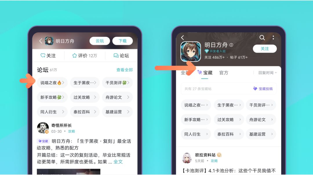 我们为部分游戏开通了「宝藏」功能,玩家可以在游戏页和论坛的「宝藏区」快捷找到该游戏的所有优质内容集合(攻略、同人等)。同时玩家也可将自己发布的内容投稿「宝藏」,入选即得实物奖励和大流量曝光。第一期宝藏功能上线论坛:香肠派对,使命召唤手游,明日方舟,原神,天地劫等热门游戏