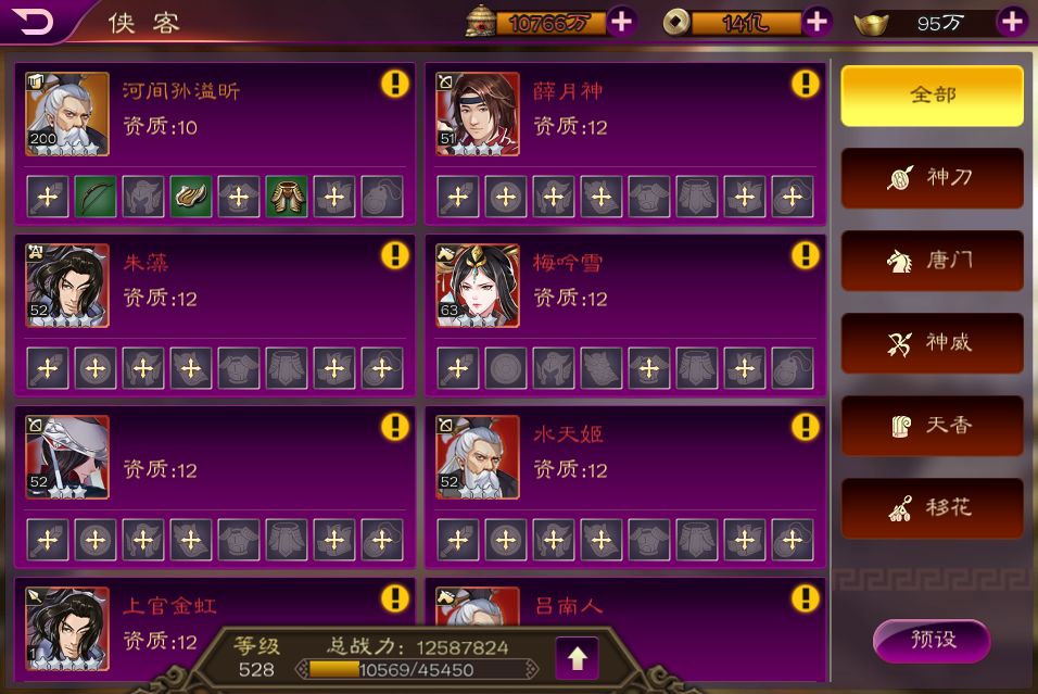 侠客分为神刀、唐门、神威、天香、移花五种属性。狭义指拥有侠客的全部战斗力之和,越高附加的属性越多,可通过收集更多侠客以及提升侠客战力来提升狭义战力。