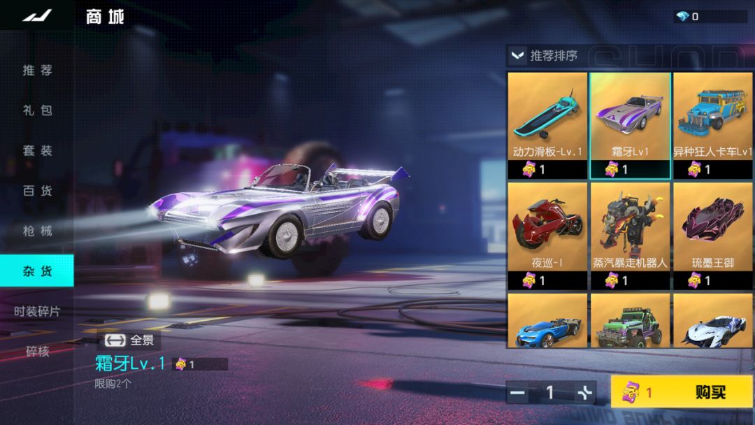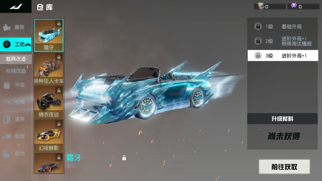 载具改造界面新增霜牙升级,消耗霜牙核心和时装碎片即可升级霜牙Lv.1,最高可以升级为霜牙Lv.3。
