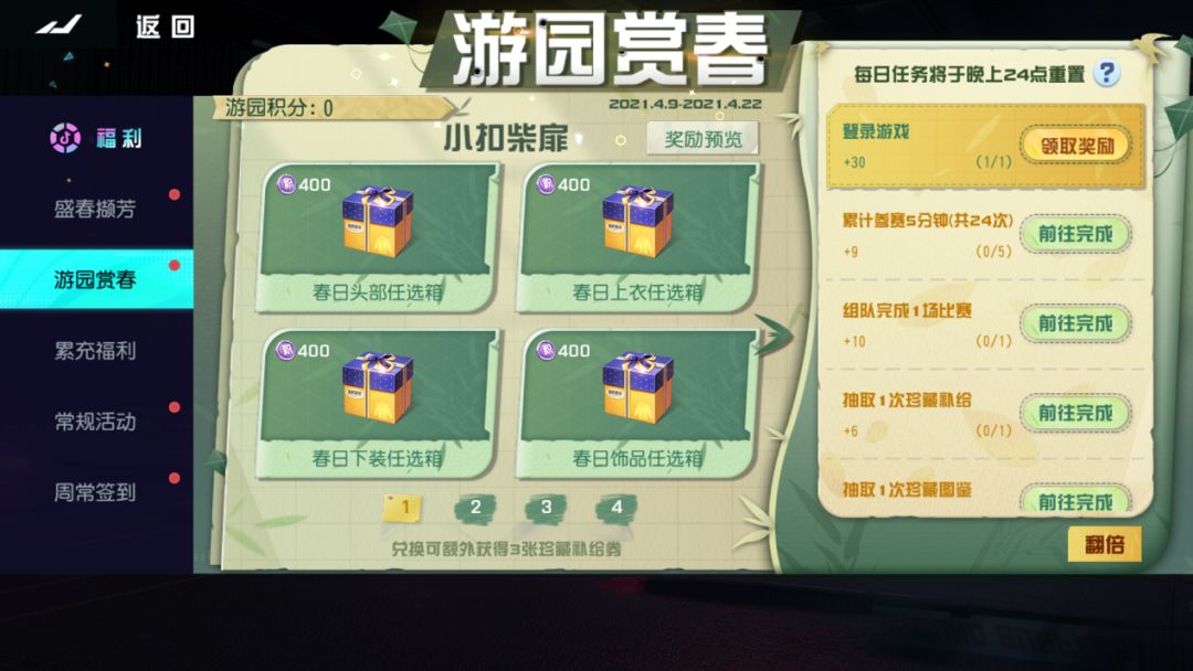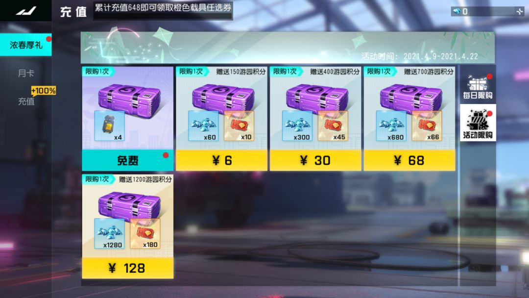 充值新增“浓春厚礼”:活动时间2021.4.9-2021.4.22 礼包内容如下: