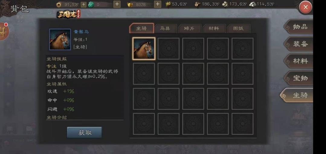 为了写本次稿子,用了两天时间大量的击杀马贼,爆率真是感人。马儿是通过击杀大世界的马贼掉落碎片合成的。蓝色马儿有三种,分别为黄鬃马、白鬃马和黑鬃马。3种马的属性都是一样的,在0级的时候都是攻速加1%,命中加0%,闪避加0%。其中黄鬃马在战斗时加0.2%的智力,白鬃马在战斗时加0.2%的武力,黑鬃马在战斗时增加0.2%的统率。由此可以得出,黑鬃马给前排的枪兵,白鬃马给后排的弓兵,黄鬃马给辅助。