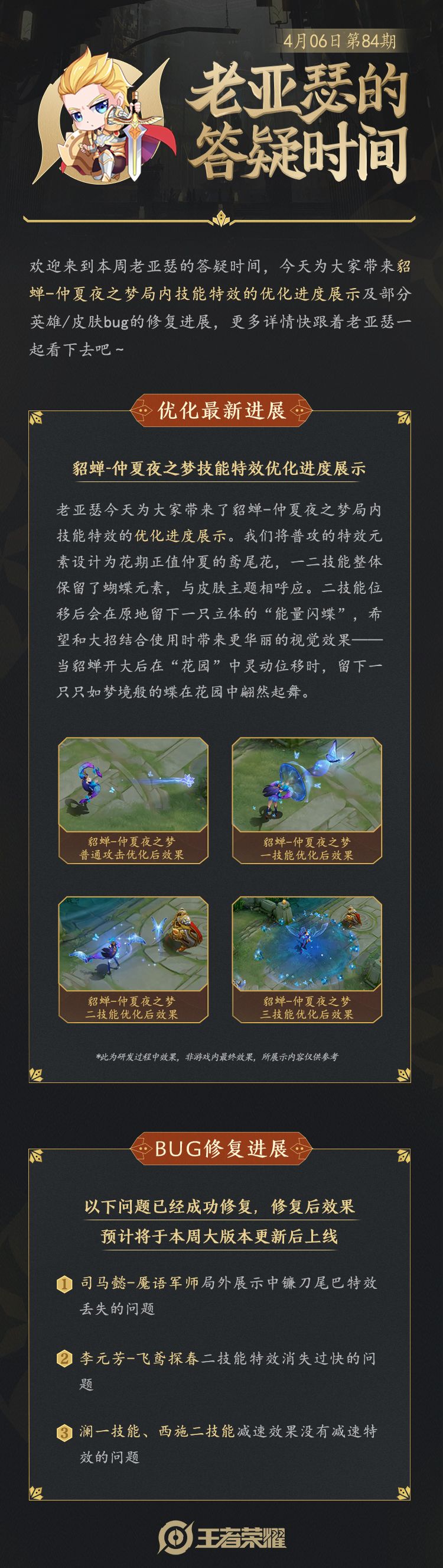 今天为大家带来貂蝉-仲夏夜之梦局内技能特效的优化进度展示,还有司马懿-魇语军师、李元芳-飞鸢探春等皮肤/英雄bug的修复进展
