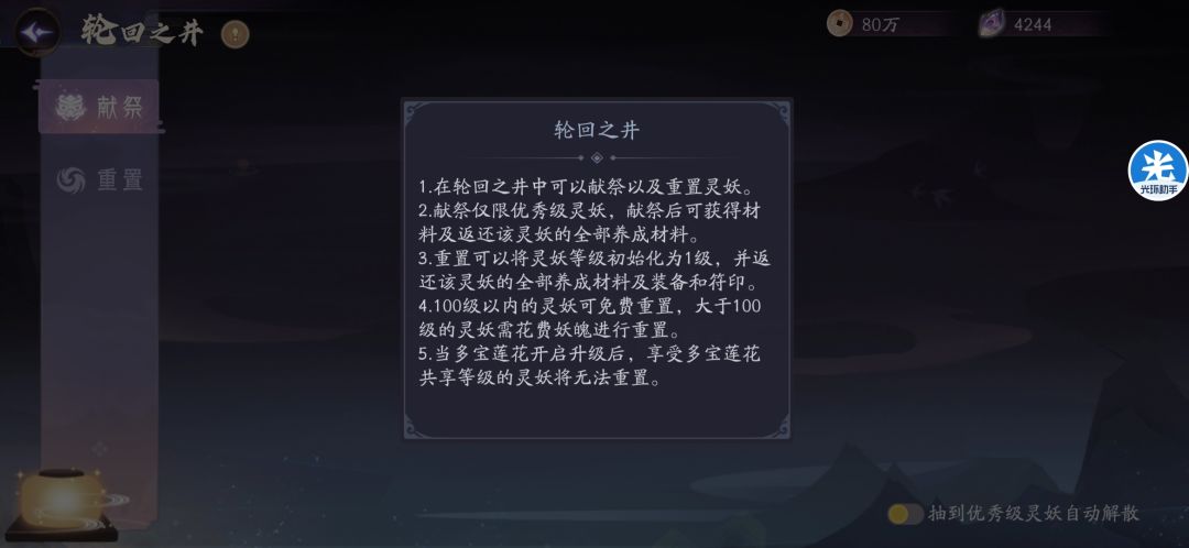 因为轮回之井目前是没有回退的,只能重生,比较良心的是,重生花费极少,二十妖魄即可。