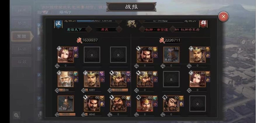 在三方平稳的拿下各自势力范围内的郡城之后,摩擦就主要集中在势力接壤处。由于各种原因汉室高战玩家席庆离团出走,活跃玩家本身不多,且中高战人数不占优,汉室在先拿北海前置城的情况下,寡不敌众无力争夺北海。另外在打郡城这块群雄为防止诸侯偷袭其郡城,用己方二团攻打本方县城可简称“卡城战术”,这里可以作为一个知识点,划重点学习下。在战术方面,诸侯在防守群雄攻打襄阳时也使出了“围城战术”,在群雄奇袭襄阳城,攻克两座前置城即将攻打襄阳城之际,诸侯用己方的二团号、小号对襄阳进行了合围,逼退了群雄的进攻,对于双方的战术,不置评论。