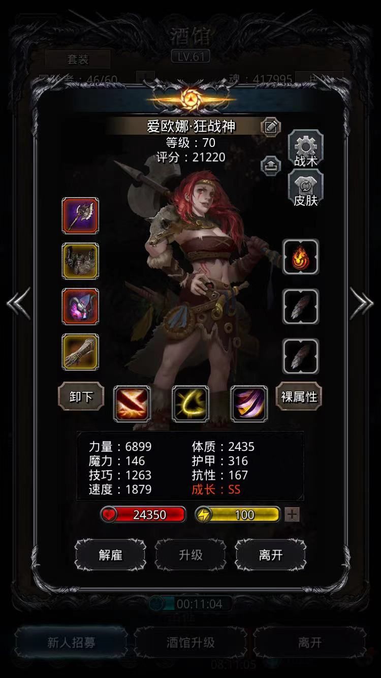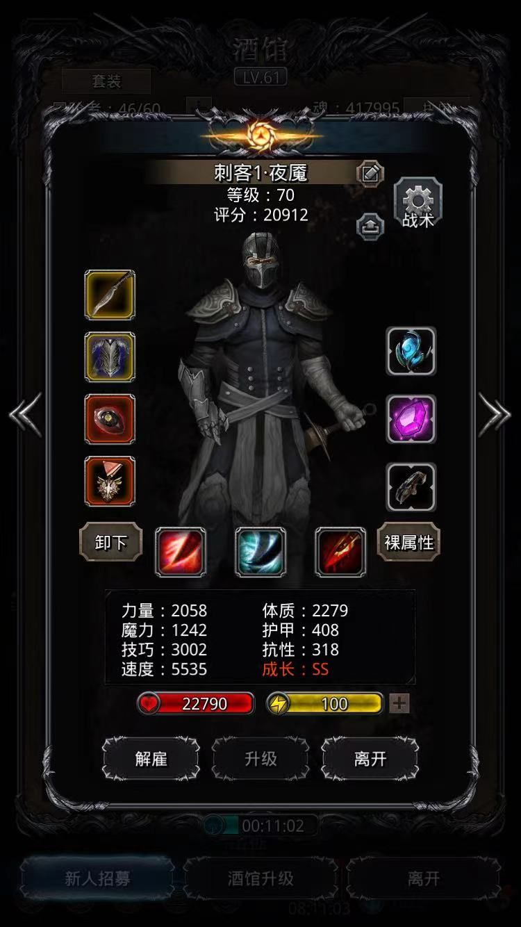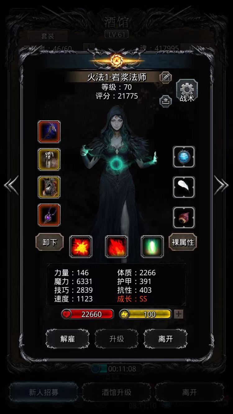 运气比较好,一把差3W,第二把过了。主要看火法的龙巫妖触发给不给力。另外三个的输出是固定的,不存在波动成分。蛮子一刀15W9、夜魇一刀11701、夜莺单项dot一下11111。法师魔石83,蛮子魔石92,夜莺魔石78,刺客魔石80,也都算不上高配。详细属性见配图。继续咸鱼去了。