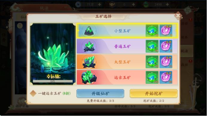 通过【升级仙矿】可以提升采集仙矿的品质,获得更大收益。每天有3次免费升级次数,提升vip可以获得更多免费升级次数,采集仙矿的品质越高,元宝和兽魂材料的收益越高,免费次数不足,则可以通过消耗元宝继续提升,每次提升有几率提升成功,提升失败则获得幸运值,幸运值满则必定升级成功,一键远古玉矿还可以享受八折的特惠,走过路过不要错过!
