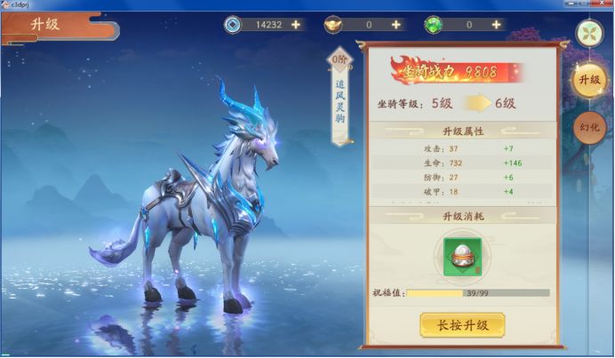 消耗初级骑灵丹即可对坐骑升级,每个初级骑灵丹增加50祝福值,祝福值满则升级成功!升级可以提升坐骑基础属性,从而增加战力。同时,激活坐骑升级属性,即可获得百分比属性加成!!初级骑灵丹可以通过副本玩法获得;