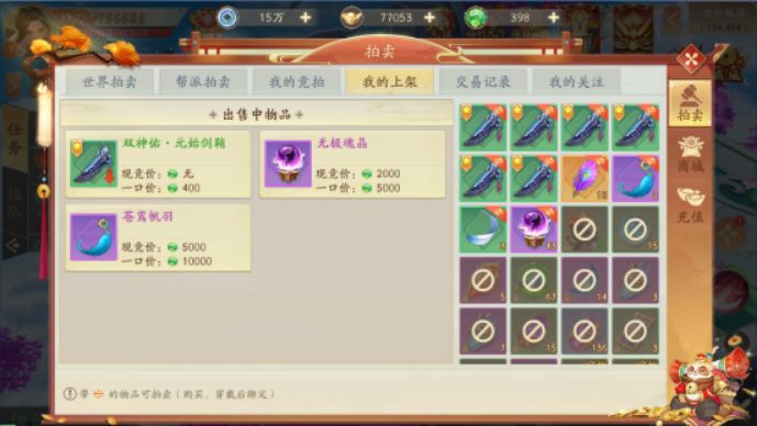 8、【拍卖行出售】游戏中的装备,仙羽,羽毛等材料都可以在拍卖行中出售,仙友们可以通过把物品挂在拍卖行出售的方式,换取元宝,拍卖行会收取一定的手续费;