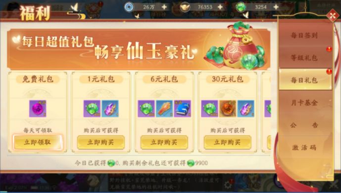 5、【每日礼包】购买每日礼包,每个档次都有大量的元宝和珍稀材料,可谓物超所值;
