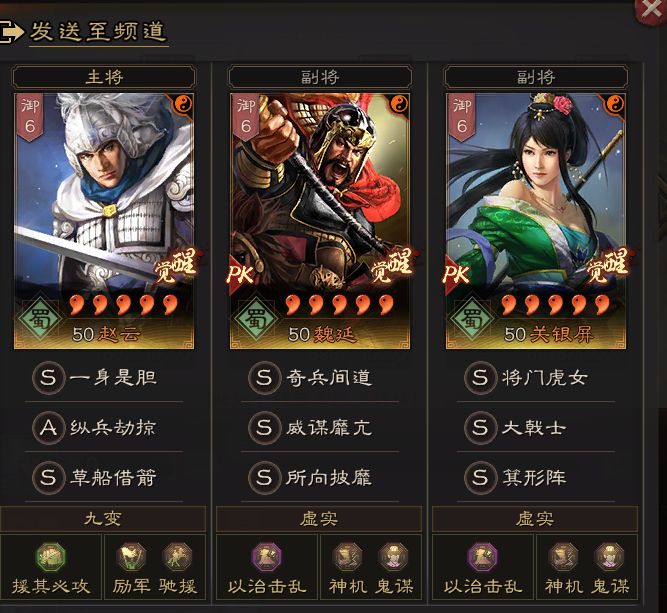 可能大家听过这么一句话“房价持平就是跌”。跟这句话道理一样,“魏延不被控就是突破”。这是情殇大佬,某个夜深人静的时分,大半夜跟我传递的智慧。听完,茅塞顿开,深以为然。魏延这个大杀器,带个威谋靡亢、所向披靡,光放在那里就是一个定时炸弹,随便放一个战法都能逆风翻盘,这还需要啥突破,只要魏延身上没控制可不就是重大突破吗?而S6的战法,草船借箭不就是一个稳定解控的手段嘛,搭配赵云就是一个定时解控装置。