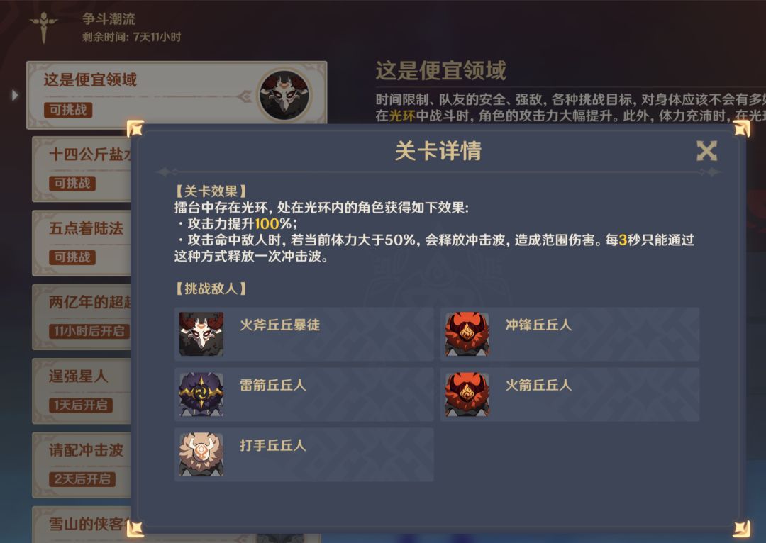 擂台中存在光环。自己队伍中任意角色在光环中连续滞留超过5秒后,将消耗光环,使接下来10秒内,队伍中所有自己的角色的攻击力提升100%,并在角色的普通攻击与重击命中时,将释放冲击波,造成范围伤害。每15秒至多通过这种方式释放一次冲击波。