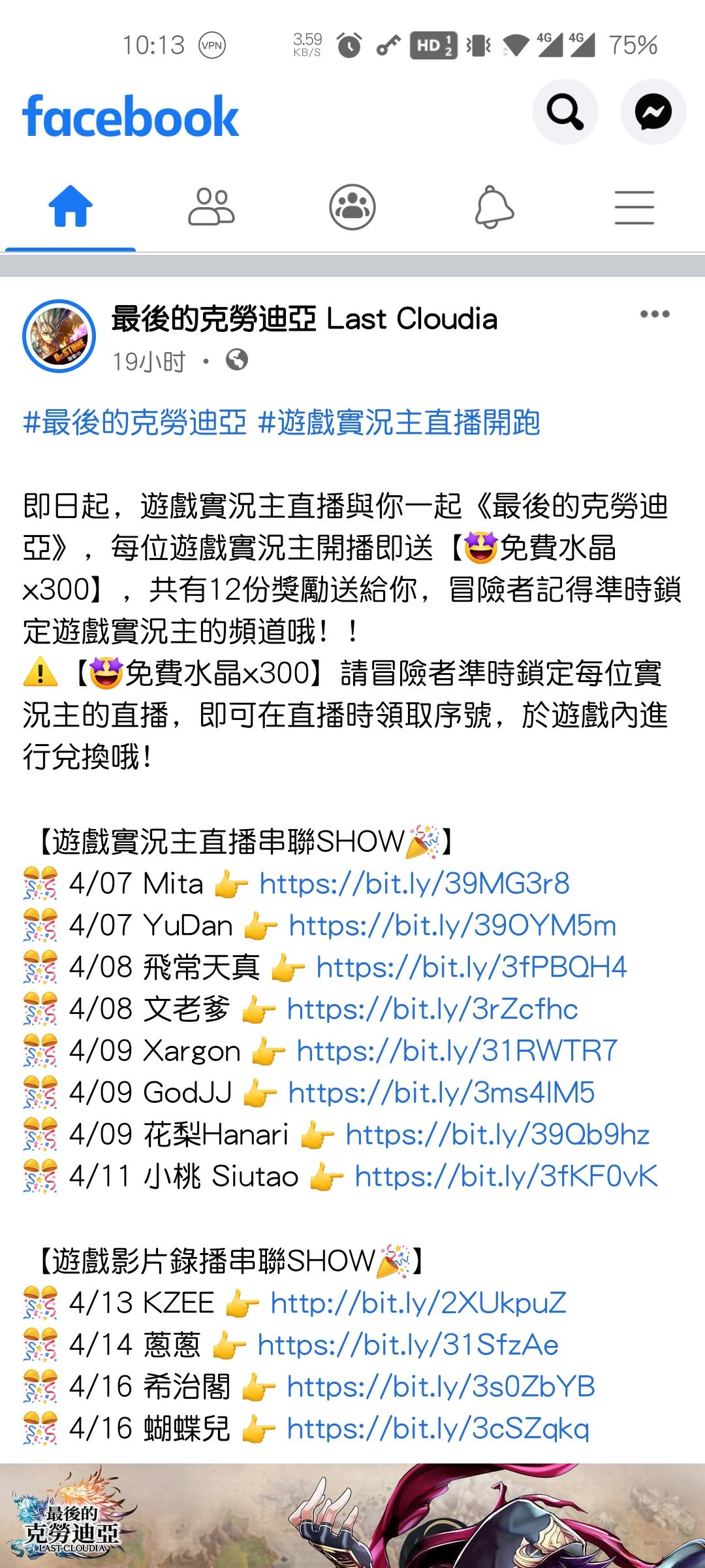刚在FB上看到的,官方在做直播活动,有礼包码,我试了下,英文名那几个主播名就是激活码,但是猜不到中文名那几个,还有倒数第二个那个的HANARI也不对,反正只猜到6个,分别是:MITA.YUDAN.XARGON.GODJJ.SIUTAO.KZEE,其他的大家试试吧,有猜到的就来分享下哈。