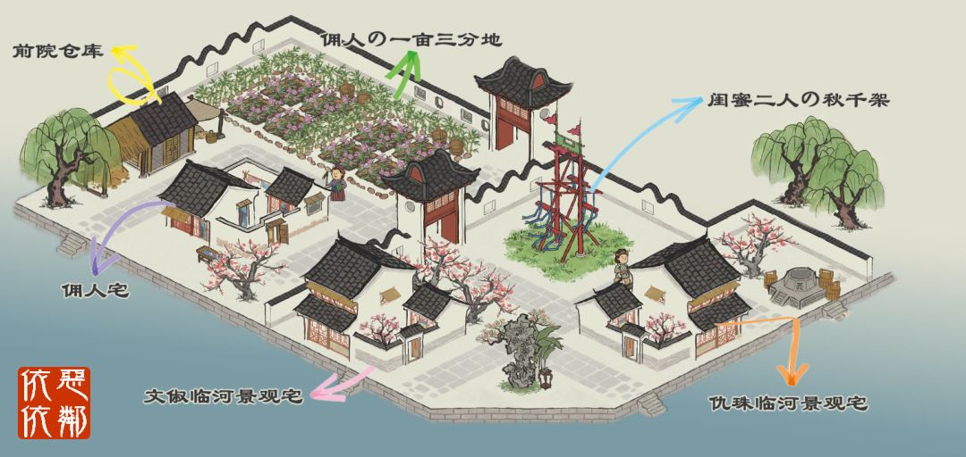 3、仇珠性格活泼,宅邸安排正对二进门,也更靠近秋千、水井等公共区域;文俶性格文静,宅邸与道路间用桃花树阻隔,除了她之外不会有人路过门口,是最最安静私密的选择~
