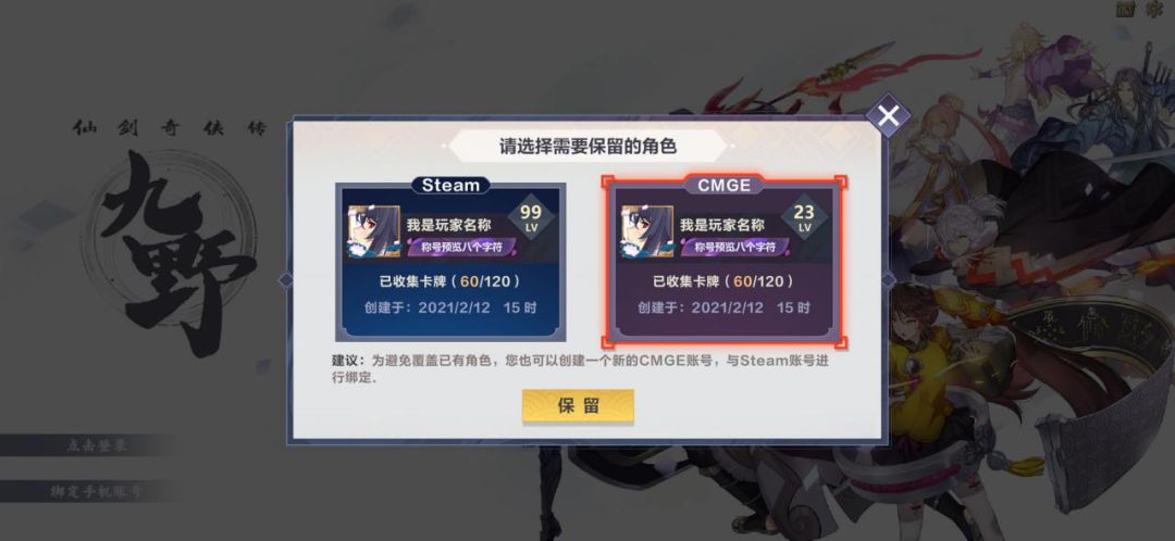 (3)登录成功后,将会显示Steam和CMGE账号下的角色信息。点击选择你想保留的角色。点击选择后,需要保留的角色上会有被选中的红框标记(请谨慎选择!)