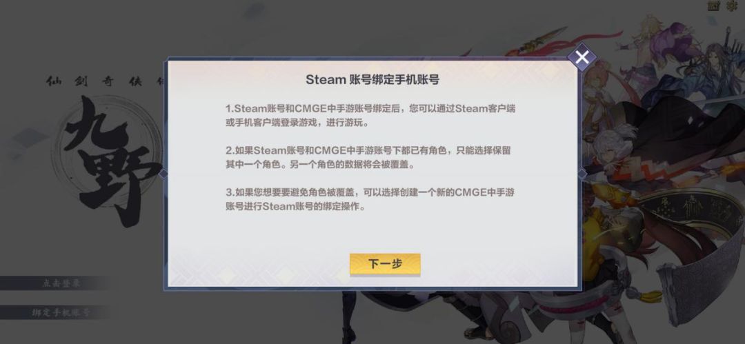 1、通服完成后,steam端的天选者需在steam端绑定CMGE账号(就是手机账号啦),即可通过任意端登录相同的《仙剑奇侠传九野》角色。手机端的天选者可以在steam端直接使用CMGE账号登录自己的角色。