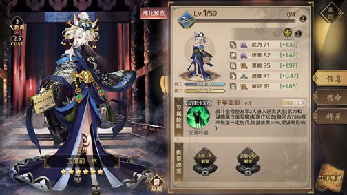 千年狐影:战斗全程友军2人进入逆流状态(武力和谋略属性值互换)和医疗状态(每回合75%概率恢复一定伤兵,恢复效果30%,受谋略影响)