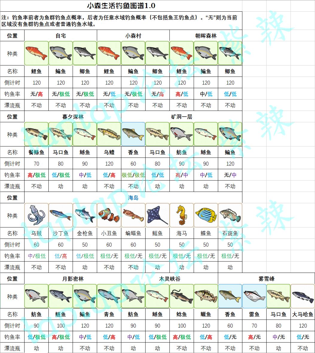 顾名思义图也简单,也就是哪里可以钓到这种鱼,配合图1使用效果更佳。海岛鱼只能在海岛产出故未列入表