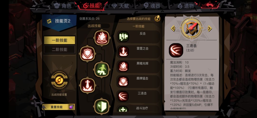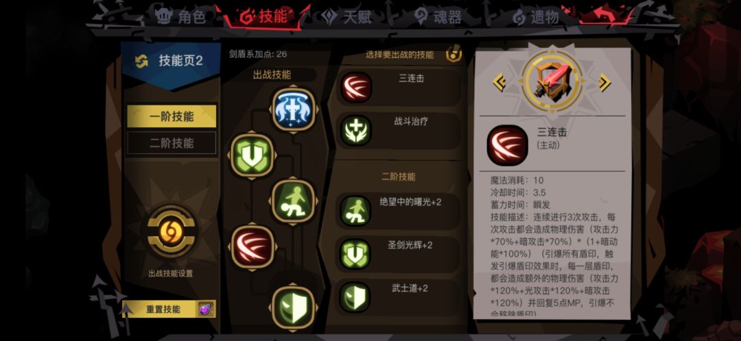 这套是打BOSS的点了光之子(复活到300钻两次) 前面换了两套技能,一套是雷霆换成三连另一套是换成固守,结果都是boss血量在10%以下之后打不掉血,血量一直在7%~9%徘徊(暗辉刷到75) 。 还有一套技能没实验过,战魂盾加点 暗辉 盾猛 治疗 固守 武士道,有兴趣的大佬可以尝试 boss打法 由于boss会回血,暗辉一定要刷高尽量75以上,可以用计算机算算面板的能刷到的最大数值,25%这样会有晕眩之后每第五次攻击会晕眩一次,在晕的时候吃两段伤害容易暴毙,喷火之后会平A一下可以接武士道刷盾,盾猛尽量留着解深红。净化安定充足的话可以一直用,25%之后一定记得用安定,能减少很多伤害,最好留个魂器或者金身到boss buff选择 盾猛解深红这个一定要,剩下可以参考之前的帖子,如果三个buff都没什么用的话可以考虑放弃(比如三个幸运),以免后面过守门不出 buff 。 最后,有其他问题可以留言,祝各位盾盾们早日过精八!