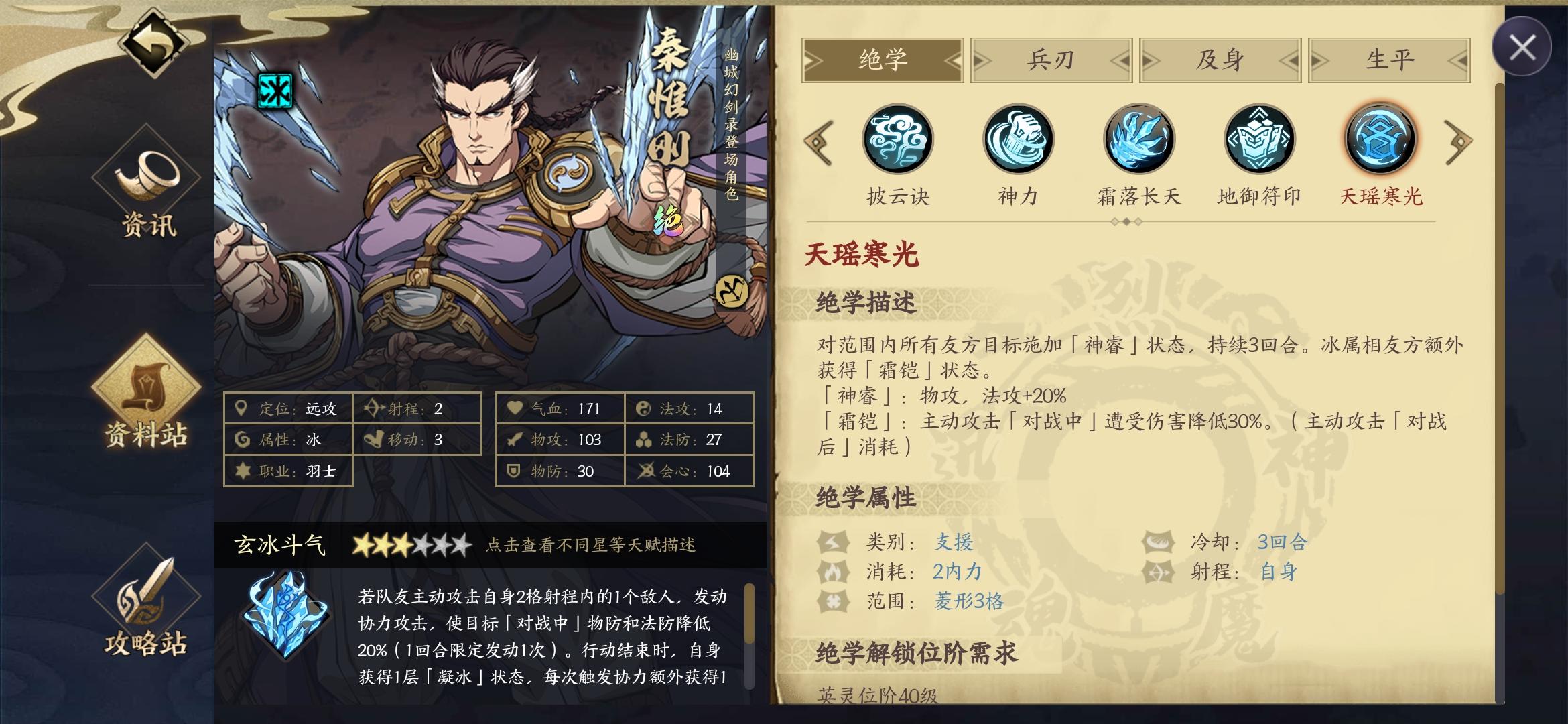 秦惟刚的定位是冰系羽士(弓手的处境不用多说),刚曝光的时候说既有输出又有辅助,后来又改成“最强辅助”,减防、破防、减伤、加攻一个不少。秦惟刚的天赋是“减双防”,技能天瑶寒光是“加攻”和“减伤”,55级技能六转寒凛是“破物防”(这两个技能就是他的核心技能),说实话,这个角色的55级大招和天赋,辅助性能挺好的。但施加“霜铠”的频率太低了,3回合冷却,“霜铠”也是仅仅限于冰系角色才能触发,限制也是比较多,频率也不行(我的太渊都需要带双aoe施加霜铠)。