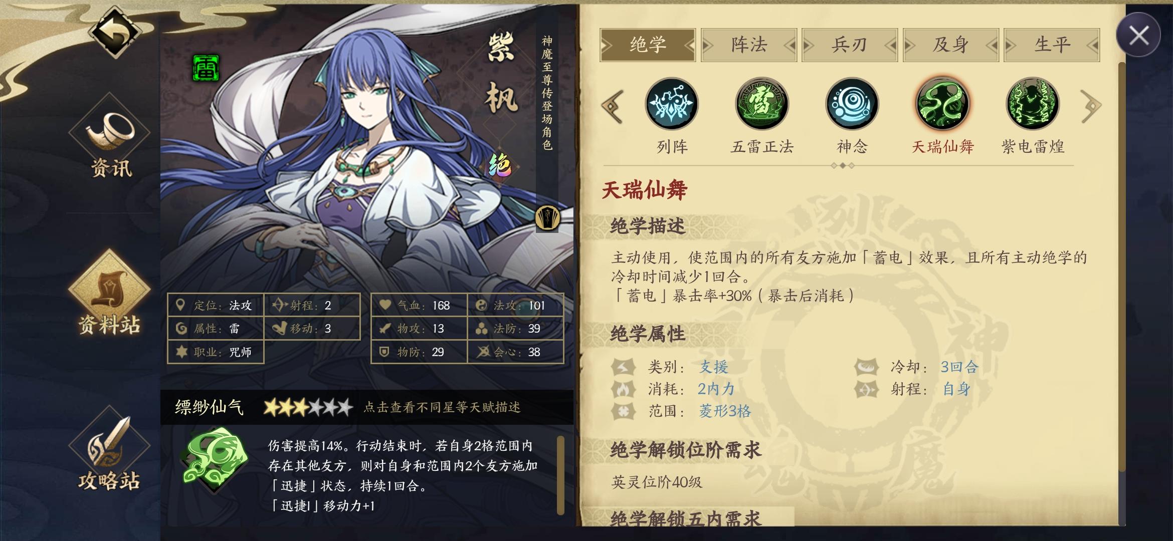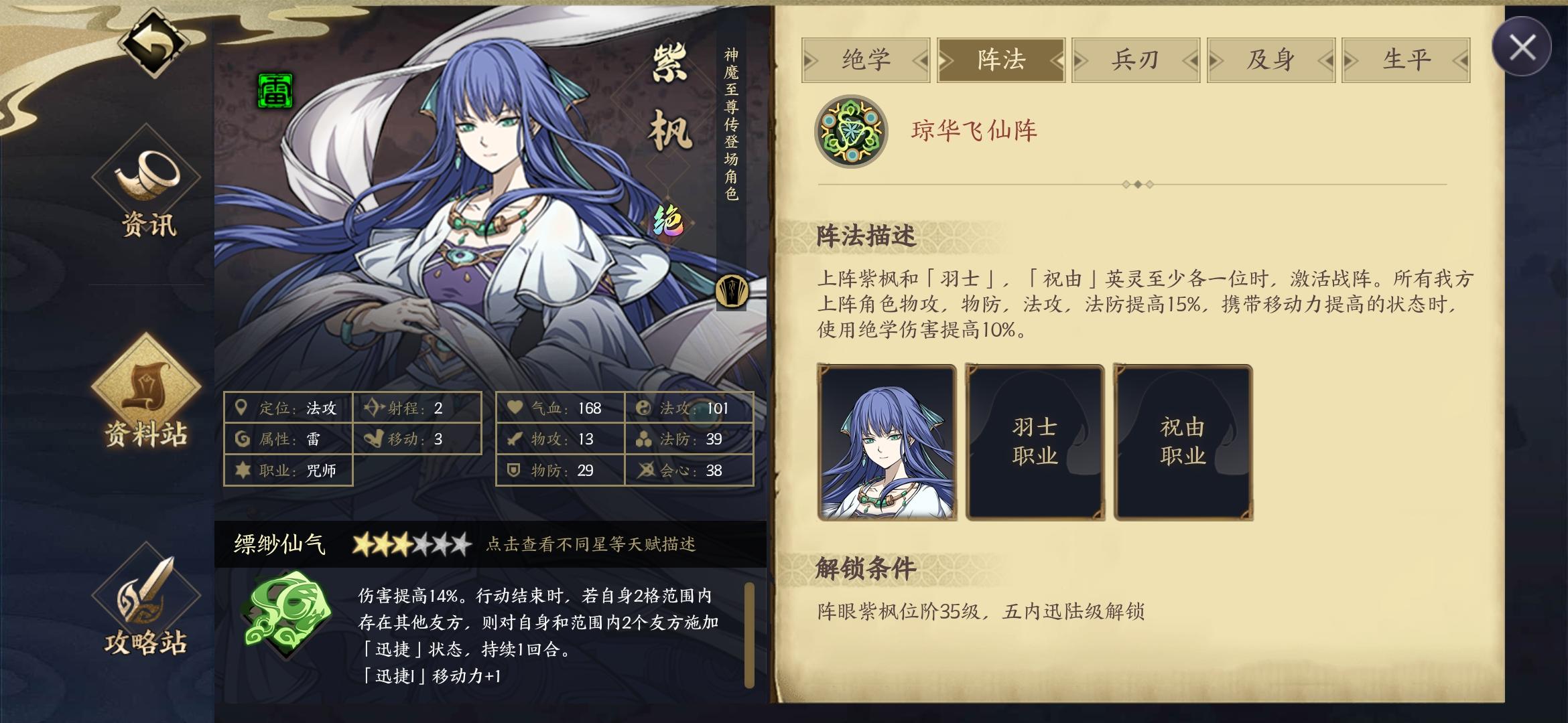 紫枫的天赋还可以,3星伤害提高14%,算是天赋中初始加成比较高的角色;移动力+1需要配合自己的战阵才会伤害加成。在副本中也可以帮助提升队伍的灵活性,躲躲boss的技能或PVP中抵消部分的迟缓效果。(在这里问一个问题,现在殷剑平和尉迟打副本你还带“起势”吗?)。