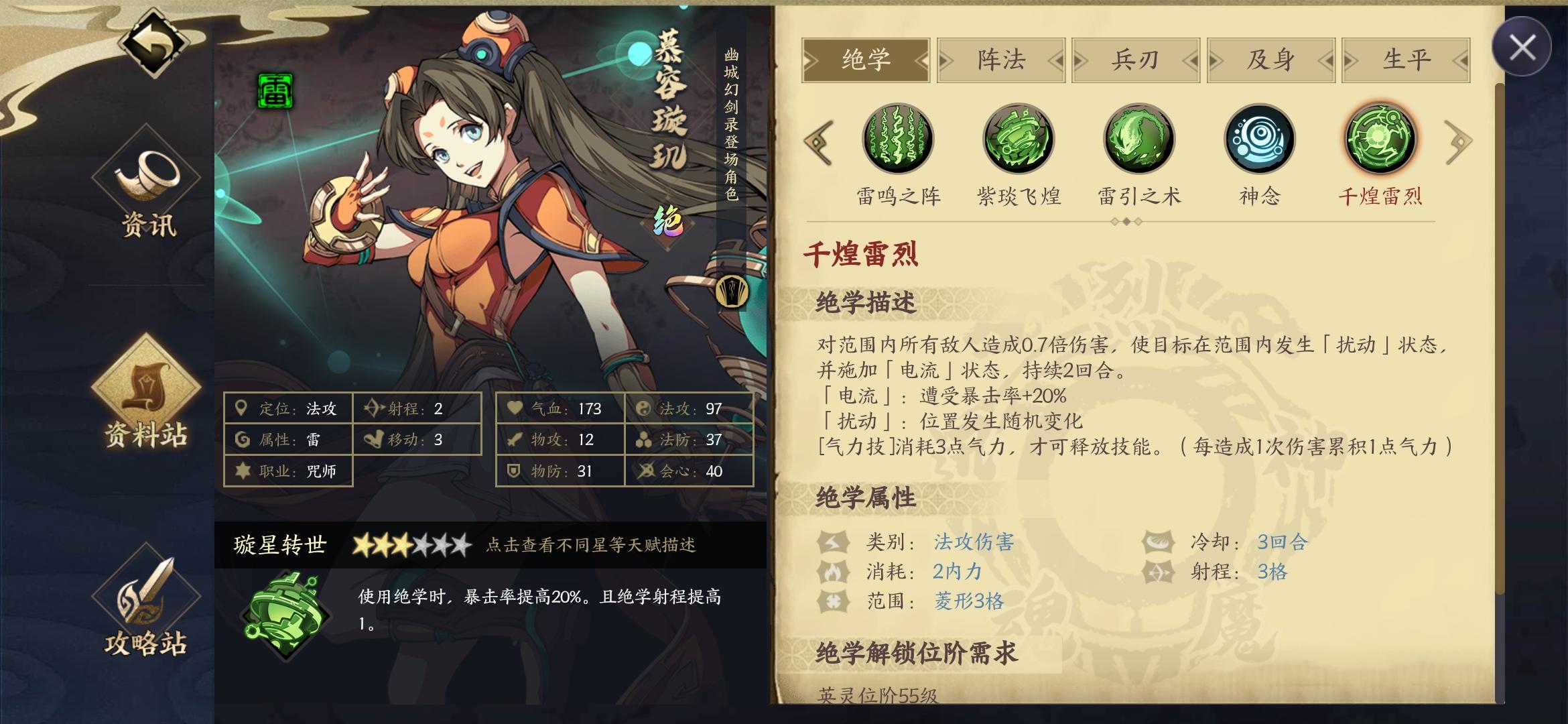 雷系角色有两个比较重要的特点:暴击和扰动,暴击的话紫枫是没有的,其实如果你认真思考下的话会发现紫枫的大招是需要雷系暴击率加成的(大招的效果就是慕容璇玑的小技能,伤害高了0.2倍),技能本身30%的暴击率在实战中还是比较看脸的,你还要其他角色为紫枫的大招提供暴击加成,比如紫韵或皇甫。如果单论角色本身伤害的话紫枫和慕容璇玑应该差不了多少,紫枫的伤害更加稳定些慕容璇玑的伤害靠暴击。
