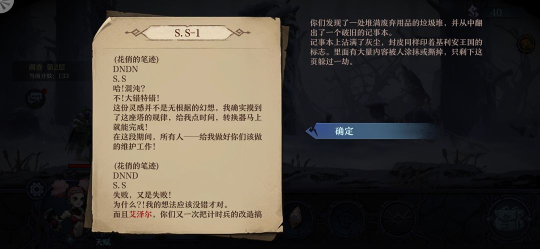在神话故事中,黑暗之神霍德尔被洛基欺骗击杀亲哥光明之神巴德尔,引发诸神黄昏。在黄昏过后霍德尔和巴德尔复活。根据神话我第一推断是巴德尔已被霍德尔击杀,这座塔是孪生神的复活之地。下图S.S.-1表示,塔最初发现并没有展现出现在的黑夜环境与光明环境,而是处于混沌之中(大约是巴德尔与霍德尔神力混合?)S.S.是学者苏瑞尔的缩写在时钟塔出发界面我们也可以看到是他发明了时间转化器。